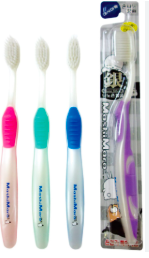 Зубная щетка премиум-класса c наночастицами серебра, сверхтонкой двойной щетиной, средней жесткости, стандартная чистящая головка, изогнутая ручка. Клиническими исследованиями доказано, что наночастицы серебра уничтожают до 99, 9 % всех бактерий, "сталкивающихся" со щетинками щетки. Щетка предотвращает появление неприятного запаха изо рта и укрепляет десны. Тонкие и мягкие заостренные верхние щетинки глубоко проникают в труднодоступные для обычных зубных щеток промежутки между зубами. Закругленные нижние щетинки прекрасно очищают зубную эмаль и не повреждают ее. Благодаря чистке зубов такими щетками улучшается кровообращение, массируются десны, повышается стойкость полости рта к инфекциям. Щетка способствует долговременному сохранению ощущения чистоты и свежести. Производится по запатентованной технологии. Антибактериальный эффект подтвержден лабораторными испытаниями.